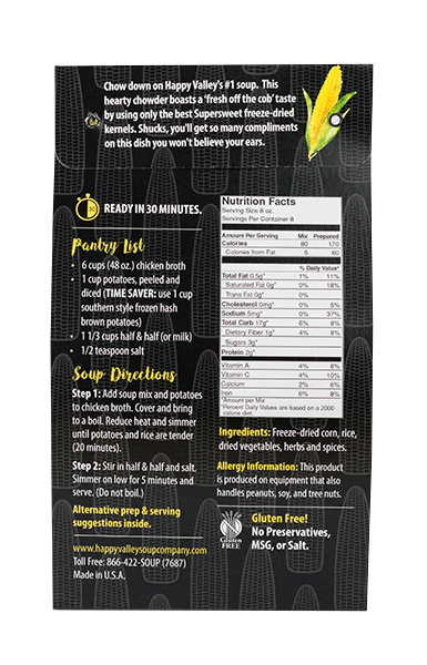 Chow down on happy valley’s #1 soup. This hearty chowder boasts a ‘fresh off the cob’ taste by using only the best super-sweet freeze-dried kernels. Shucks, you’ll get so many compliments on this dish you won’t believe your ears.