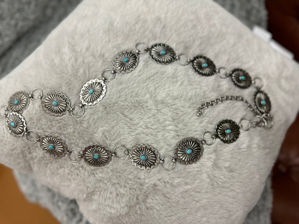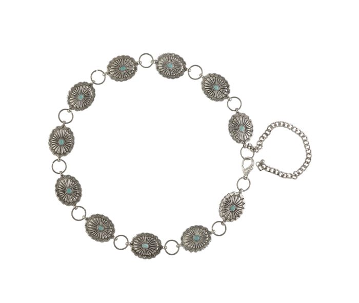 This Metal Concho Belt is a bliss for your ranch days. Now slay in style with your Concho belt while riding some horses out! This boasts synthetic turquoise & a long extension chain to flaunt that style!