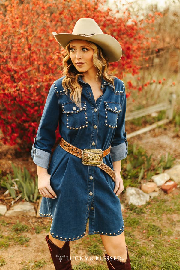 Denim button down dress with vintage studs detail and adjustable sleeve and front chest pockets