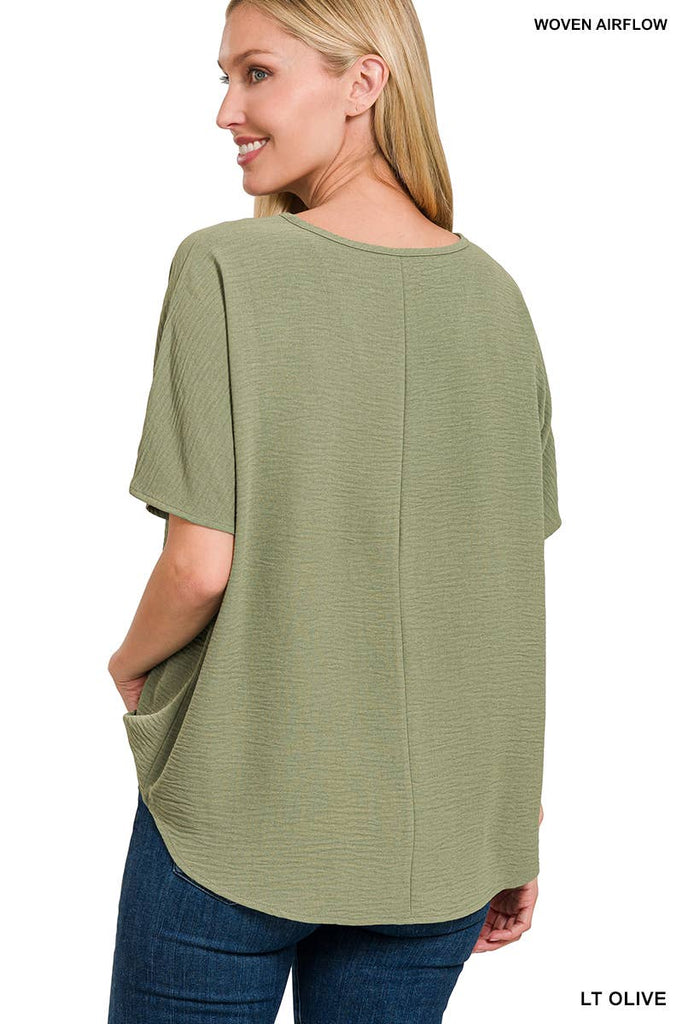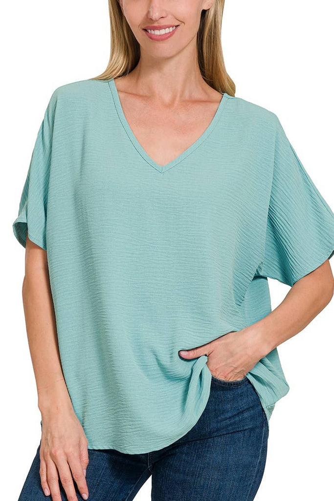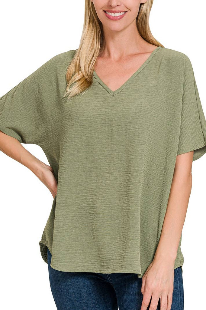 Woven Airflow V-neck Short Sleeve Top Total Body Length: 26.5", Bust: 46" Approx. - Measured From Small * Color May Vary Slightly Due To Monitor Resolution Fabric 100% Polyester Made In Vietnam Womens Clothing, Apparel, Western Apparel, Western Wear, Plus Size Clothing, Plus Size Apparel, Spring Clothing, Summer Clothing, Jeans, Denim Jacket, Maxi Dress, Tumblers, Plus Size Outfits, Dresses, Tank Tops, Spring Dresses, Summer Dresses, Jean Shorts, Zenana , Spring Tops, Summer Tops, Denim Shorts, Swimwear, Shorts, Romper, Jumpsuit, Linen Pants, Biker Shorts
